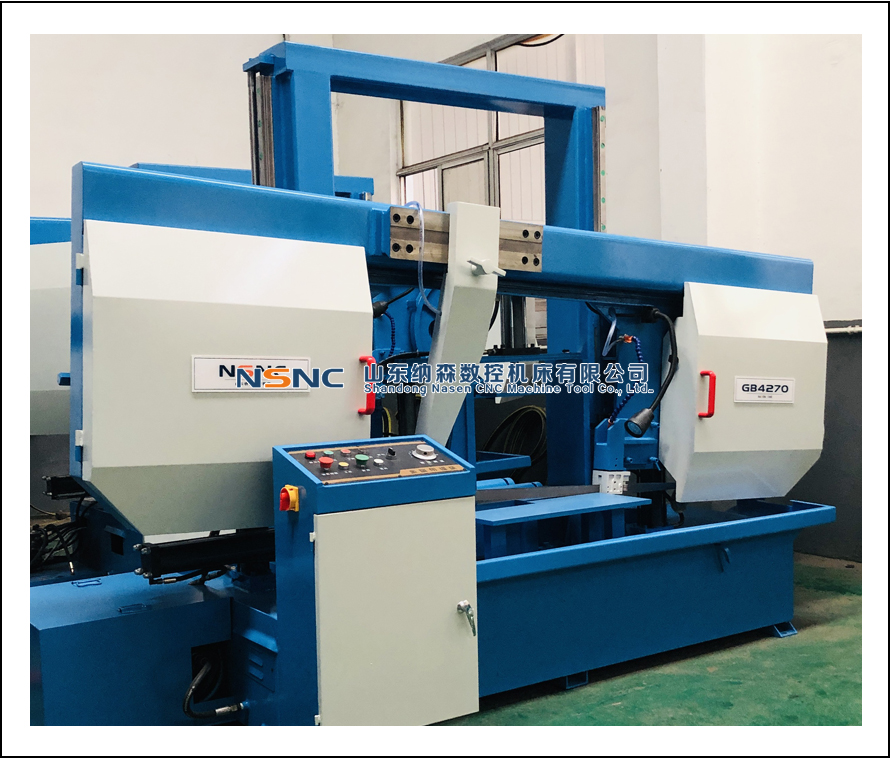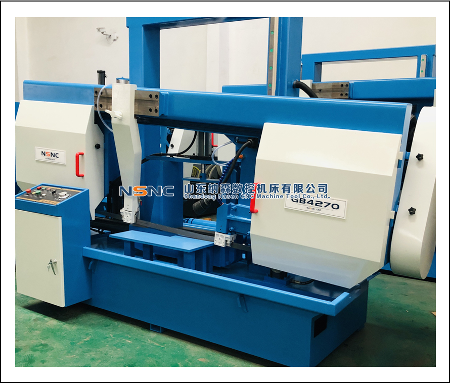 3.機(jī)床結(jié)構(gòu)為雙柱液壓式,穩(wěn)定性好,精度高,科學(xué)合理的導(dǎo)向塊可以保證鋸條平穩(wěn)切削沒有馬蹄形,延長鋸條的使用壽命。