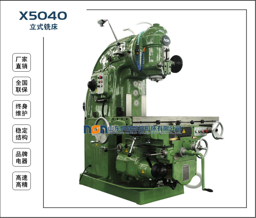 X5040立式銑床是一種強(qiáng)力金屬切削機(jī)床。該機(jī)床剛性強(qiáng),進(jìn)給變速范圍廣,能承受重負(fù)荷切屑。主軸錐孔可直接或通過附件安裝各種圓柱銑刀、圓片銑刀、成型銑刀、端面銑刀等刀具,適于加工各種零件的平面、斜面、溝槽、孔等,是機(jī)械制造、模具、儀器、儀表、汽車、摩托車等行業(yè)的理想加工設(shè)備。
