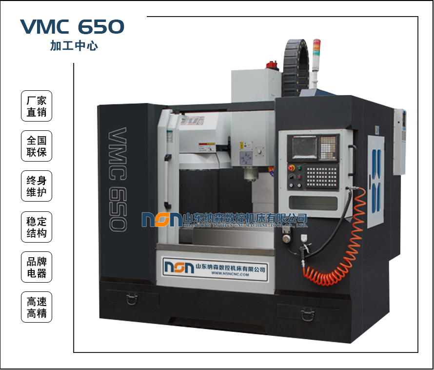 VMC650加工中心為X、Y、Z三軸伺服直聯(lián)控制半閉環(huán)立式加工中心,三軸均為鋼球滾動(dòng)直線導(dǎo)軌,導(dǎo)軌負(fù)載大、跨距寬、精度高,XY向?yàn)?5MM重載,Z向?yàn)?5MM重載,其他廠家TOM-L850才使用此規(guī)格的直線導(dǎo)軌,結(jié)構(gòu)及外形尺寸緊湊合理,主軸為伺服電機(jī)通過(guò)同步帶驅(qū)動(dòng)。能夠?qū)崿F(xiàn)對(duì)各種盤類、板類、殼體、凸輪、模具等復(fù)雜零件一次裝夾,可完成鉆、銑、鏜、擴(kuò)、鉸、剛性攻絲等多種工序加工,適合于多品種、中小批量產(chǎn)品的生產(chǎn),能滿足對(duì)復(fù)雜、高精度零件的加工??膳涞谒男D(zhuǎn)軸,以滿足特殊零件的加工要求。