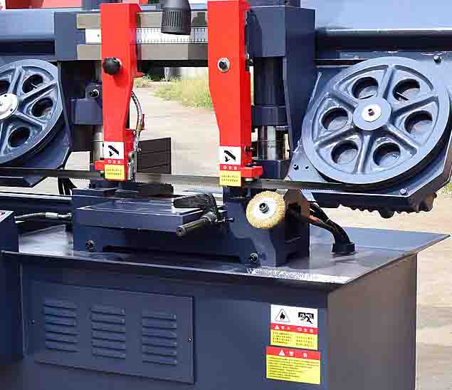 臥式帶鋸床重要部位還有雙立柱臥式帶鋸床的鋸梁,這是用厚鋼板成型焊接的,剛性非常好,連接著有渦輪箱,內(nèi)有渦輪和鋸梁上的主動(dòng)輪固定的,結(jié)合同步轉(zhuǎn)動(dòng),另一邊就是被動(dòng)輪和鋸條的張緊構(gòu)造。